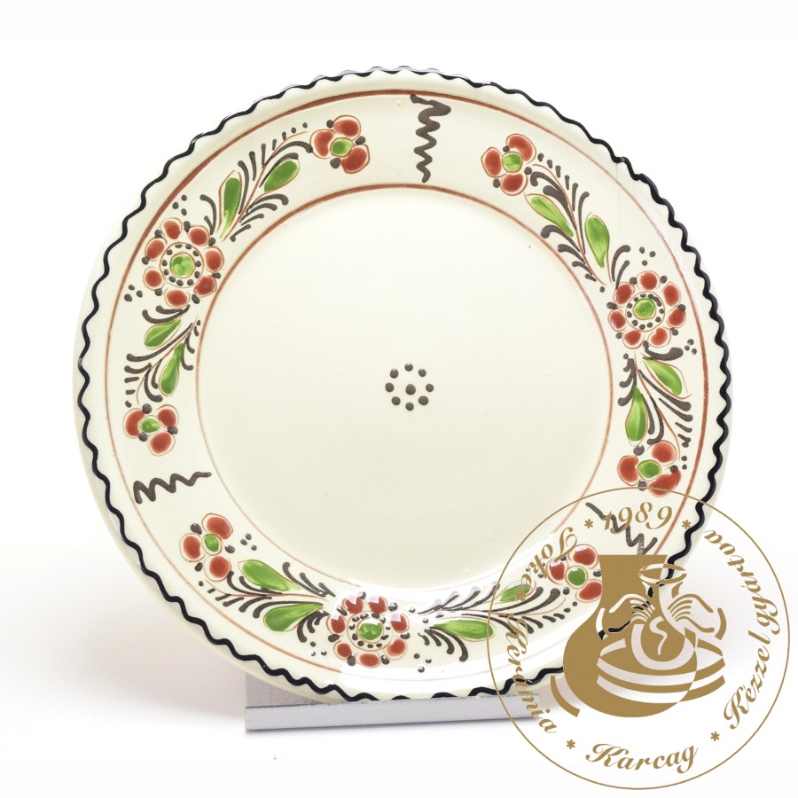 Lapos szervírozótányér. Nagy mérete miatt bőséges étel tálalható fel benne. Átmérője 23cm. Tiszafüredi mintával díszítve. Mikrohullámú sütőben és mosogatógépben használható. Egészségre ártalmas anyagot nem tartalmaz. Kézműves termék.