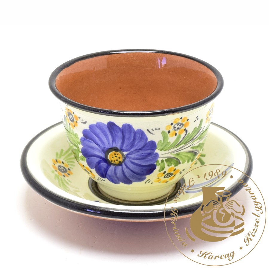 Kapucsínósbögre alátéttel, 11cm-es átmérővel, kék és sárga ecsetes mintával díszítve. Mikrohullámú sütőben és mosogatógépben egyaránt használható. Étkezésre alkalmas, vidám hangulatú használati, kézzel készült kerámia termék 2,5dl-es űrtartalommal.